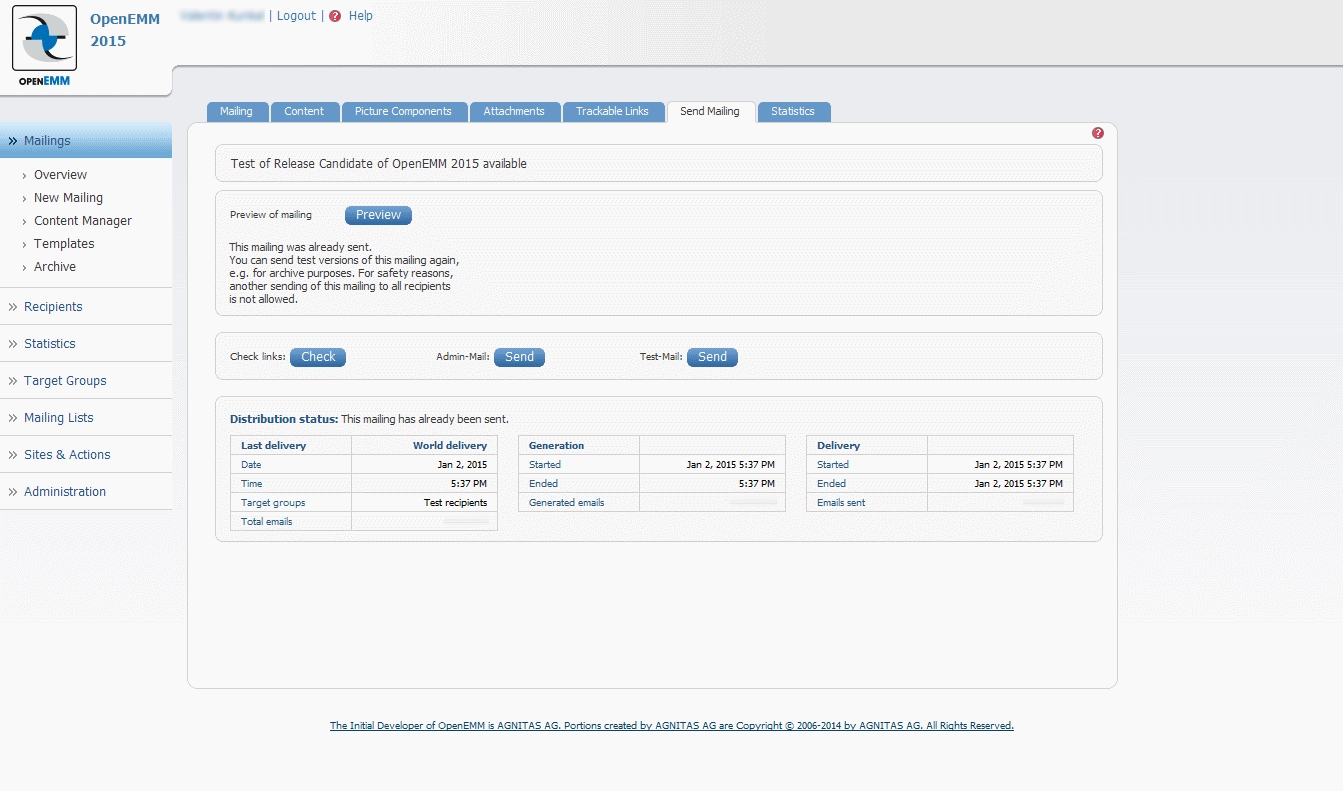 ![]() [ download press photo ] | title: OpenEMM 2015 image text: The new interface for the sent mailings is just of the many individual improvements which contribute to greater user-friendliness copyright: AGNITAS AG |